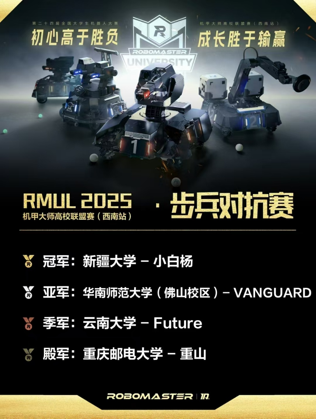 "小白杨"战队在2025 RoboMaster机甲大师赛(西南站)比赛中凭借卓越表现和团队协作勇夺步兵对抗赛总冠军!